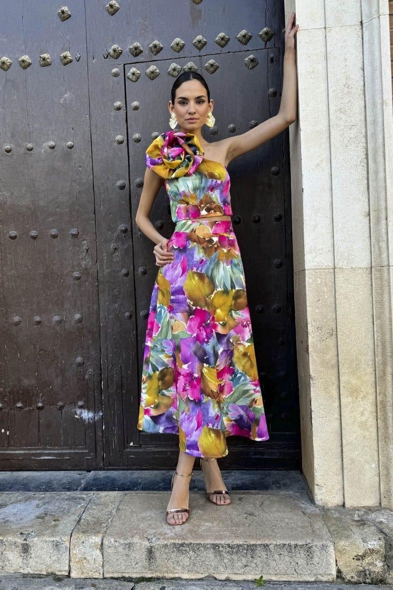 Embrace your femininity with the Alegria Set. The floral print maxi skirt pairs fresh look and the asymmetrical top adorned with a delicate flower detail. Feel confident and stylish all day long in this versatile set.